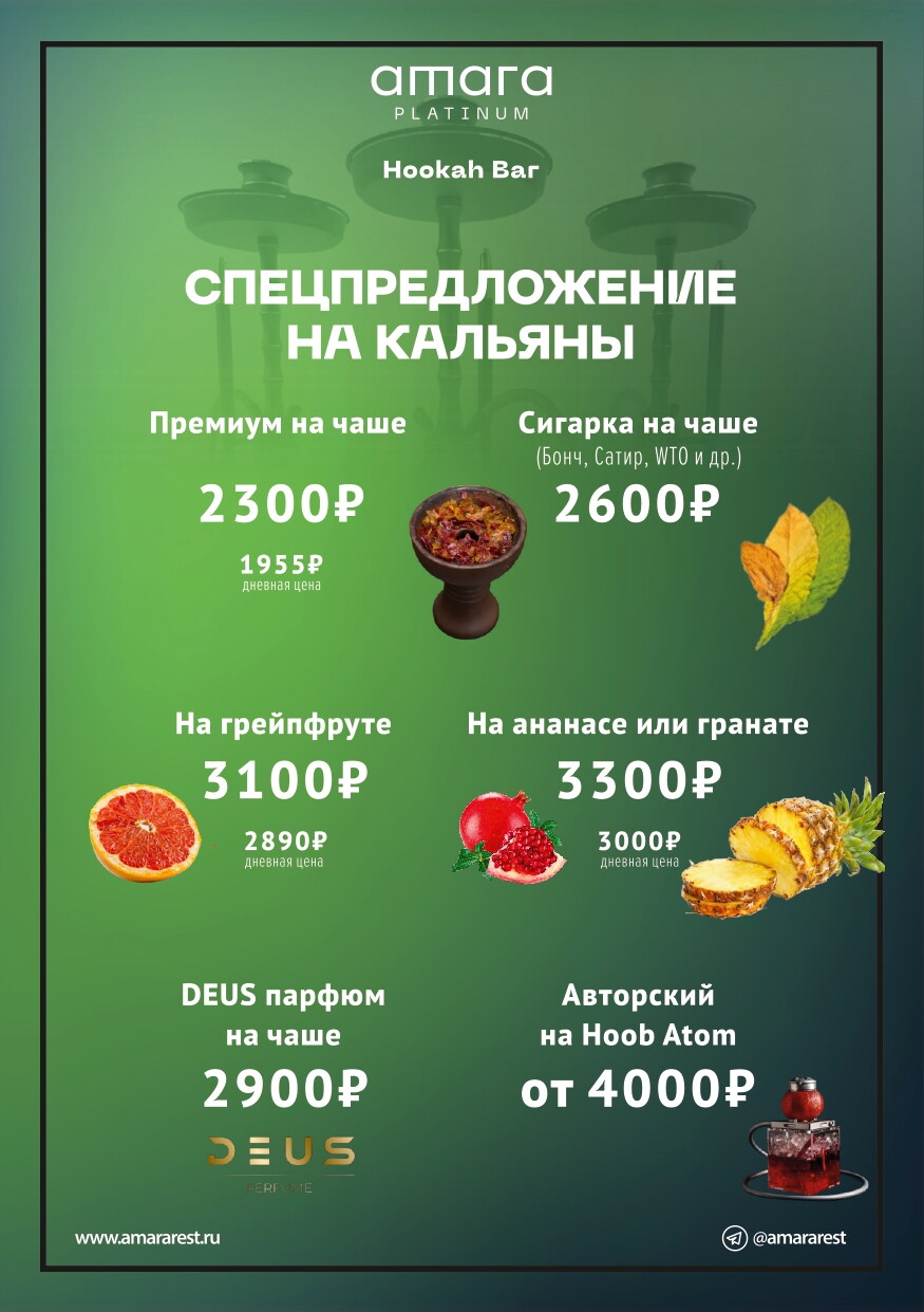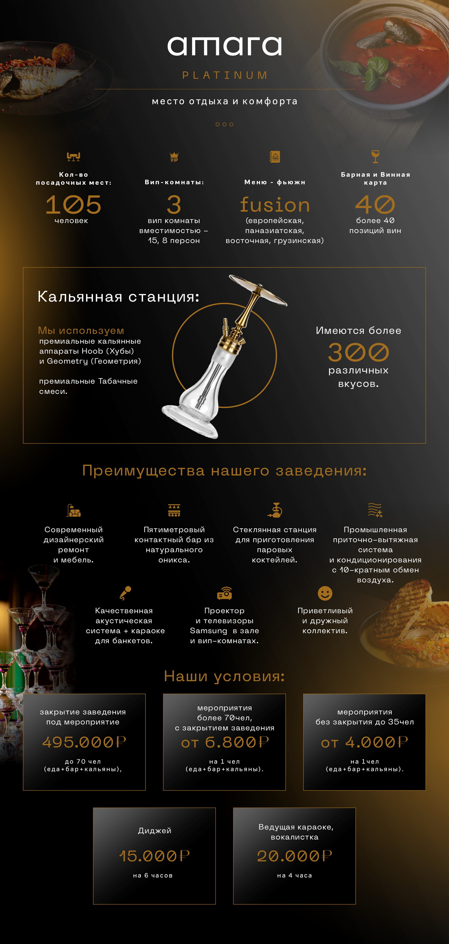 Преимущества: Здравствуйте. Решила оставить свое мнение. Отмечали свой юбилей в ресторане Amara Platinum и остались очень довольны! Интерьер заведения оформлен в современном стиле, атмосфера очень уютная и дружелюбная. Понравилось авторское меню, каждое блюдо было приготовлено с большим мастерством и вниманием к деталям. Винный бар порадовал разнообразием напитков и качеством обслуживания. Кальян был отличного качества, ароматный и горячий, прекрасно дополнил общую атмосферу праздника. Рекомендую это заведение всем, кто хочет провести незабываемый вечер в уютной обстановке с вкусной едой и отличным сервисом! Персонал работает просто супер. Обязательно вернемся еще. Спасибо!